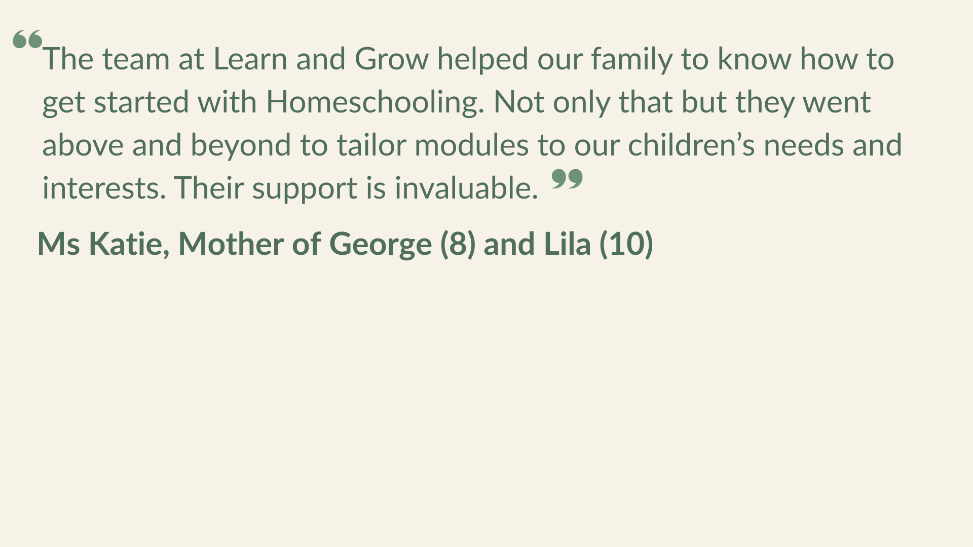 Quote from Ms. Lynsey about her sons loving the Forest School Module, learning skills like Orienteering, cooking, water conservation, and den building, and looking forward to the next session.
